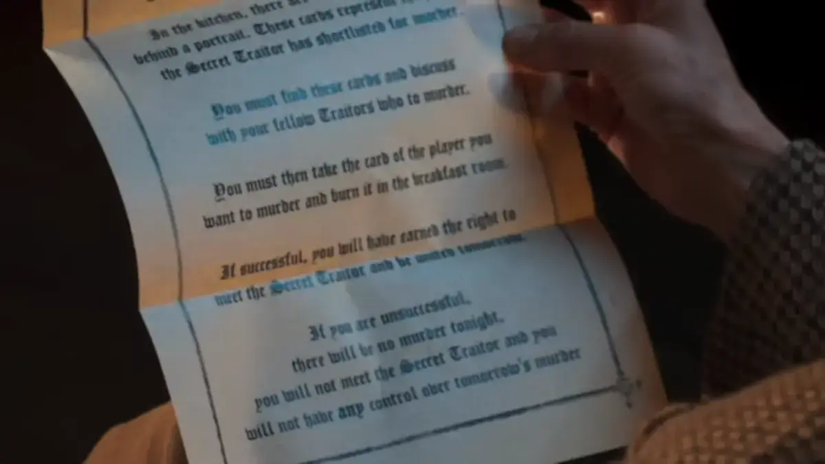 Instead of meeting privately and choosing a name the usual way, the Traitors had to burn a Faithful’s card in the fireplace inside the breakfast room. If they pulled it off without getting caught, they earned the reward of meeting the Secret Traitor face-to-face.