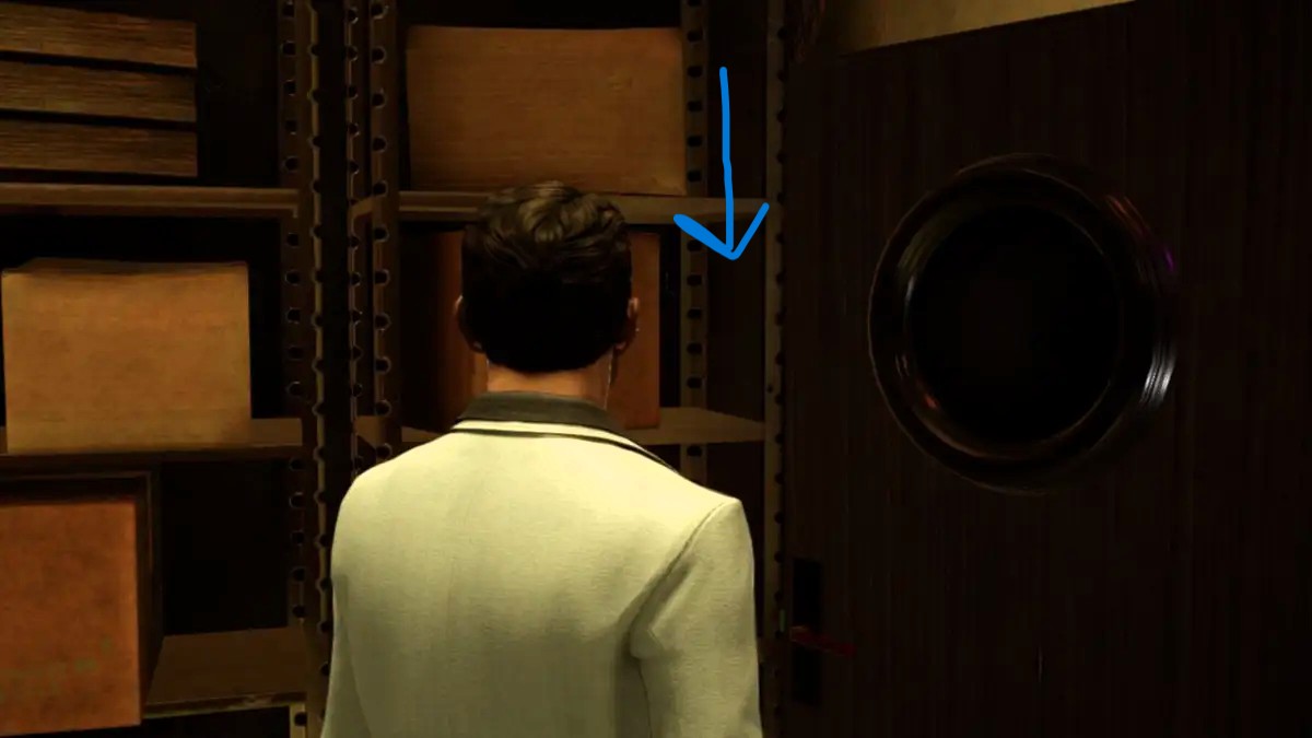 Enter the storage room behind the bar, the same room where Jackie grabs a record for the DJ. The Golden Vinyl sits on the shelving between a box and the wall.
