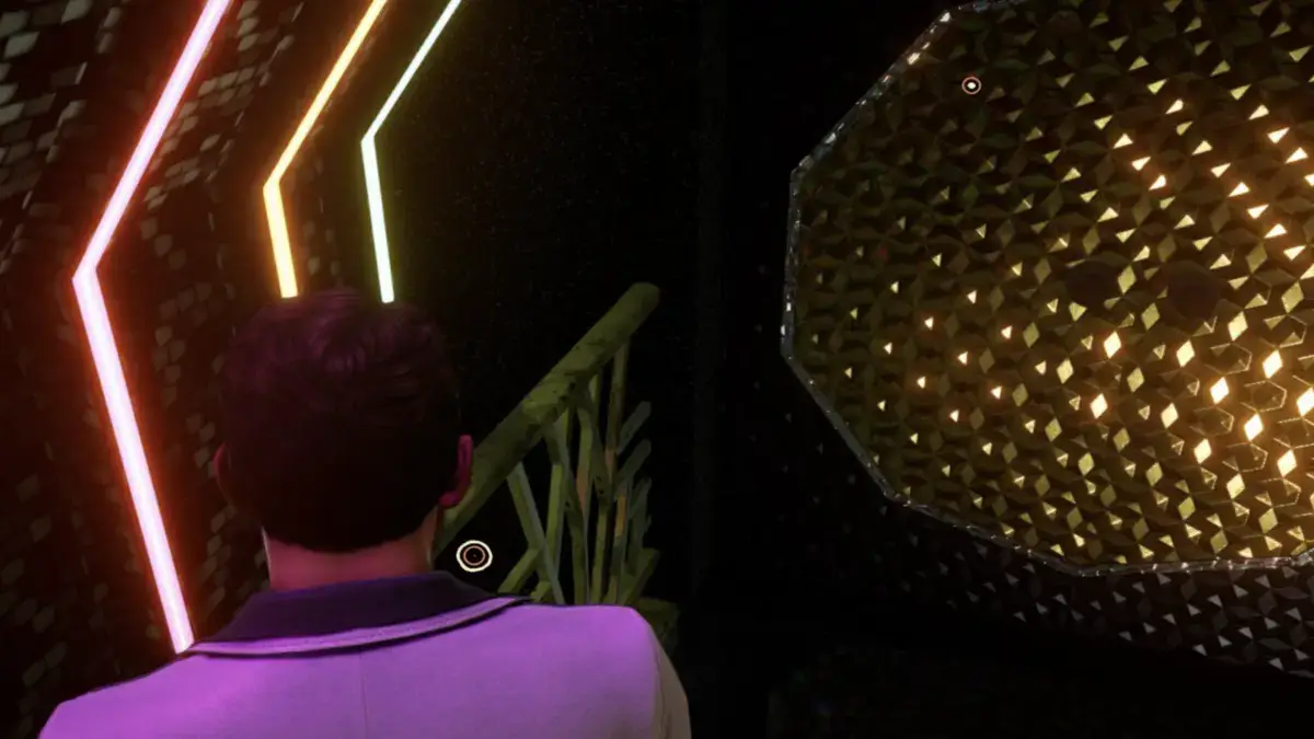 Exit the club interior to the long walkway with colored lights. As soon as you step outside, turn right and wait for the door to close behind you. The Golden Vinyl wedged into the gold handrail. If you do not see it, hug the right wall and nudge the camera closer until the pickup prompt appears. In our image, it is marked by the white circle.